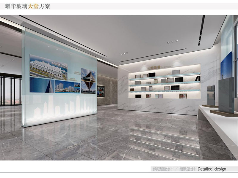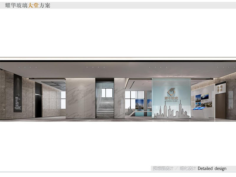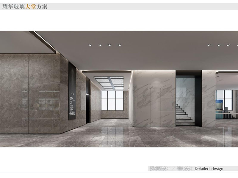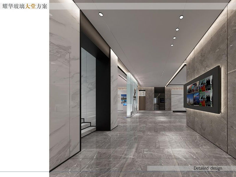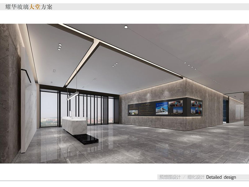 設計理念: 耀華玻璃大堂裝修效果彰顯出企業的大氣與現代感。在大堂內樹立起一個耀華的標志性展示,巧妙展示了耀華玻璃的工藝精髓。墻面與地面材質選擇考究,與玻璃元素相得益彰,整體色調和諧統一,既展現了企業的專業形象,又營造出賓至如歸的溫馨氛圍。