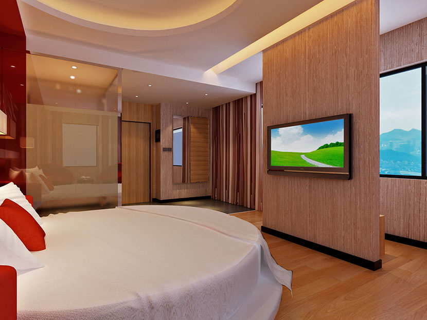 設計理念: 圓床房裝修效果獨特而浪漫,以圓形為主題設計。床頭背景墻采用柔和的色調與溫馨材質,利用鮮艷的紅色搭配軟包,圓形的床架搭配舒適的床墊與抱枕,不僅視覺上新穎別致,更提供了全方位的舒適體驗。房間內燈光設計柔和,通過壁燈、臺燈以及可調光的主燈,營造出浪漫溫馨的氛圍,讓情侶們共度美好時光。整體裝飾簡潔而不失精致,每一處細節都透露著對浪漫與舒適的追求。